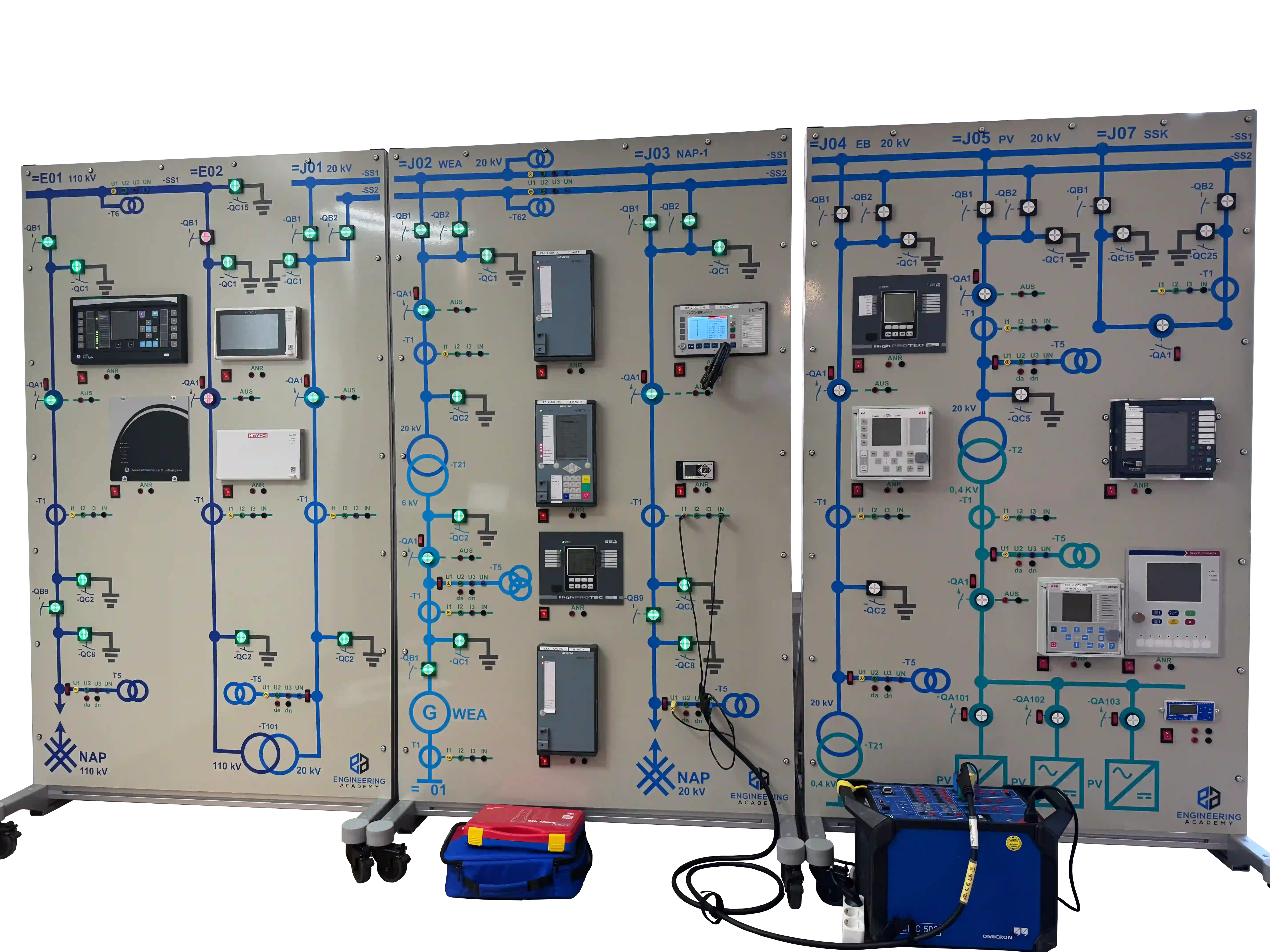 Wir schulen unsere Auszubildenden ausdrücklich nur auf den modernsten Geräten, die derzeit verfügbar sind. Im Bereich der Prüftechnik nutzen wir Omicron (CMC 500, Station Scout, C-Pol-Check, Compano und CT-Analyzer), Megger (SVERKER 900) und KoCoS (ARTES 600 und ARTES RC3) und mehr. Zudem schulen wir auf einer Vielzahl von Schutzrelais und Herstellern (z. B. SEG, Siemens, Schneider, ABB, Hitachi, GE, A.Eberle, NSE und mehr).